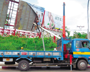 5月11日,在缅甸最大城市仰光,工人们抢修被风暴破坏的电力线路。目前,仰光全市电力供应恢复程度达到20%左右。 新华社记者 张云飞 摄