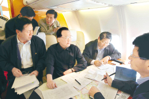 | 中共中央政治局常委、国务院总理温家宝在赶赴灾区的专机上研究布置抗震救灾工作。 新华社记者 姚大伟 摄 |