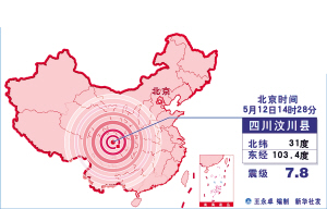 新华社北京5月12日电 据国家地震台网最新测定,北京时间5月12日14时28分,在四川汶川县(北纬31度,东经103.4度)发生7.8级地震。