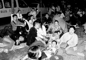 五月十二日,成都市棕北小区的居民在室外摆上地铺,准备熬夜躲避余震。 新华社记者 陈燮 摄