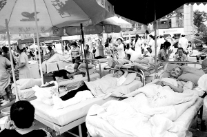 | 5月12日,汶川地震发生后,距离震中心较近的成都温江等一些区县的医院将病人转移至空旷地带。 新华社记者 刘海 摄 |