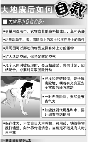 “发生大地震时一定不要慌乱,在短时间内应根据所处环境选择避险场所。”刘允秀说,“在楼房的群众应尽快到玄关、洗手间、小开间等跨度小的地方,或室内梁柱比较密集处躲避。有可能的话,最好找一个枕头、沙发垫等物品垫在头顶,进行自我保护。”地震时如在商场、学校等人群密集场所,应立即到坚固物品、课桌或椅子下面躲避,如震后不幸被废墟埋压,要尽量保持冷静设法自救。无法脱险时应尽量保存体力,耐心等待救援。