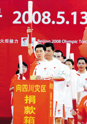 | 5月13日,北京奥运圣火传递活动在福建省龙岩市举行。图为火炬手向四川地震灾区捐款。 新华社发 |