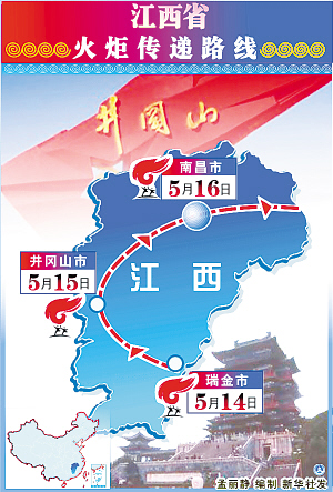 根据北京奥组委的安排部署,奥运火炬在江西省境内传递时间为三天,5月14日在红色故都瑞金,5月15日在红色摇篮井冈山,5月16日在“军旗升起的地方”南昌传递,总行程约800公里。