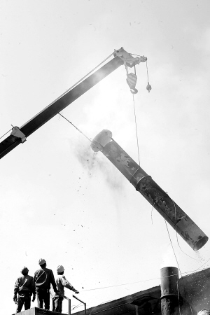 5月12日,青海省乐都县一家铁合金生产企业的烟囱被切割后吊离。 为整治污染,改善环境,当地环保部门近日对铁合金生产企业的矿热炉烟囱进行切割、封闭,防止企业偷排粉尘,确保企业环保设施正常运转。 新华社记者 侯德强 摄