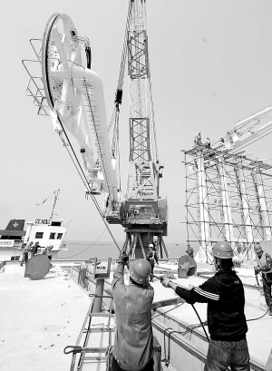 5月13日,建设者在天津港30万吨级原油码头安装大型输油臂。 当日,总投资额13.79亿元的30万吨级原油码头工程项目安装完成首批设备———大型进口输油臂。该码头泊位总长468米,码头前沿水深25米,可停靠30万吨级大型原油船舶,预计全部工程将于今年8月底竣工,届时天津港新增吞吐能力2000万吨。 新华社记者 刘海峰 摄