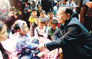 | →5月13日,温家宝总理在四川绵阳九州体育馆地震灾民安置点看望灾民。这是温家宝在安慰受伤儿童。
