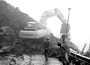 | 5月13日,救援人员在加紧疏通都汶公路。都汶公路是都江堰至汶川的高等级公路,受地震影响交通中断。