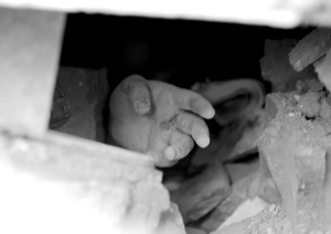 5月13日,在四川绵竹市汉旺镇一所中学内,一位被埋在废墟中的女学生伸出一只求援的手不停地呼唤着“救救我”。救援人员在现场鼓励受困者:“坚持住,马上救你出来!” 新华社记者 李晓果 摄