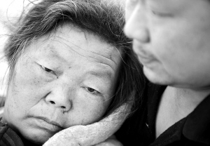 5月13日,在四川绵竹县的一处临时救援中心,一位男青年陪护着受伤的母亲。 新华社记者 李晓果 摄