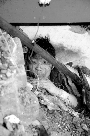 | 5月13日,在北川县中学,一位被困在废墟中的孩子经过紧急救助后等待救援。 新华社记者 李刚 摄 |