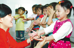 | 5月13日,海口市一家幼儿园老师在检查孩子们的手是否洗干净了。