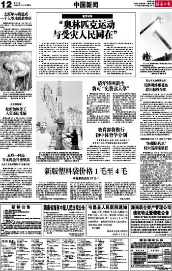 海南日报 中国新闻 012 2008-05-141 2008年05月14日 星期三