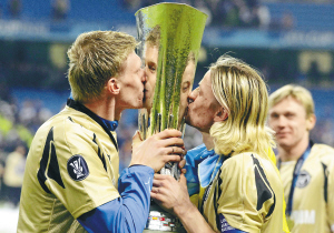 5月15日,在曼彻斯特举行欧洲联盟杯足球赛决赛中,超级黑马俄罗斯圣彼得堡泽尼特队以2:0战胜苏格兰格拉斯哥流浪者队,获得冠军。图为泽尼特队球员亲吻奖杯。 新华社发