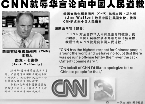 近日,CNN总裁致函中国驻美国大使,代表CNN正式向中国人民道歉。信函说,“CNN对全世界华人怀有最崇高的敬意。我们确信,中国人民确实被卡弗蒂的评论所冒犯。我谨代表CNN就此向中国人民道歉。”