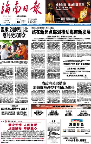 海南日报 头版 001 2008-05-161 2008年05月16日 星期五