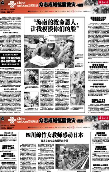 海南日报 众志成城抗震救灾·驰援 004 2008-05-161 2008年05月16日 星期五