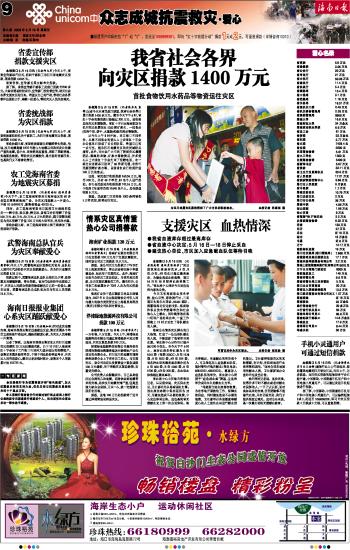 海南日报 众志成城抗震救灾·爱心 009 2008-05-161 2008年05月16日 星期五