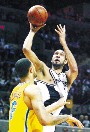 5月15日,在NBA季后赛西部半决赛中,圣安东尼奥马刺队主场以99比80战胜新奥尔良黄蜂队。双方总比分以3比3战平。图为马刺队邓肯(右)在比赛中投篮。 新华社发