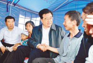 | 五月十六日,中共中央总书记、国家主席、中央军委主席胡锦涛驱车赶赴受灾严重的绵阳市北川羌族自治县,看望慰问受灾群众,指导抗震救灾工作。在北川县擂鼓镇胜利村,胡锦涛走进救灾专用帐篷,关切地询问村民的受灾情况。