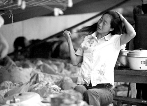 | 5月16日清晨,甘肃省陇南市文县碧口镇的一位女士在灾民聚居点梳头。因为有爱,灾区人民必定能够渡过难关。 新华社记者 武斌 摄 |