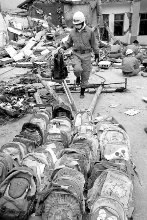 5月15日,在四川省什邡市红白镇中心小学废墟旁,河南省消防总队抗震救灾突击队的搜救人员将找到的孩子们的书包整齐排放,等待家长认领,以告慰生者。五颜六色的小书包仿佛一个个鲜活的幼小生命立于记者的眼前。 新华社发 (张晓理 摄)