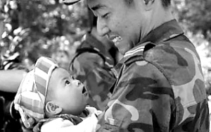 | 一名战士慈爱地抱着从废墟中救出来的孩子。 新华社发 |