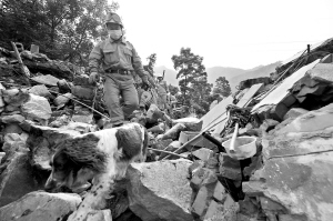 | 一队搜救人员在废墟里用搜救犬寻找幸存者。 新华社发 |
