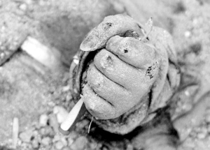 | 这是5月16日晚拍摄的四川省绵竹市汉旺镇东汽中学发掘现场的一幕———一名死难学生手里紧紧攥着一支笔。 新华社发