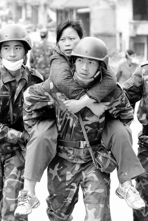 | 5月15日,来自湖北的解放军空降兵某部黄继光连的战士在四川省什邡市红白镇营救受伤群众。战士们轮流背着受伤群众连续跋涉4个多小时到达了医疗救治点。 新华社发(张晓理 摄) |