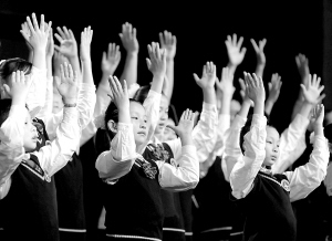 5月17日晚,在南京市文化艺术中心举办的“我们心连心”大型赈灾义演晚会上,南京聋人学校的学生在表演手语节目。 当日,南京各界在多处市民广场和剧场举办赈灾义演活动,许多市民、学生和企事业单位代表来到各义演现场为四川地震灾区捐款。 新华社发