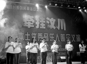 5月16日晚,由海口广播电视台、海南省和海口市红十字会等单位联合主办的“牵挂汶川”海南本土优秀音乐人士大型赈灾义演晚会,在海口明珠广场举行。晚会最终募得289.4870万元,将通过省、市红十字会捐给灾区人民。本报记者 戎海 摄