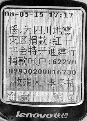 “刚收到这条手机短信我还真信以为真了,正准备让老婆去银行汇款,但转念一想不对啊,为地震灾区捐款怎么能汇到个人账户呢?”5月15日上午,市民符先生说。