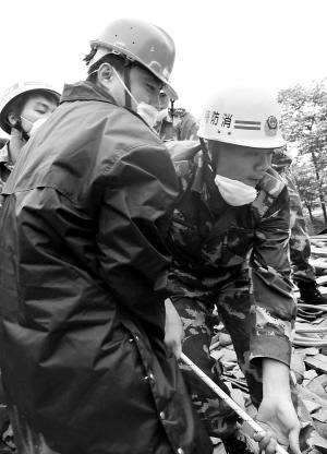 ←李岱原(左)和海南地震紧急救援队一起救援幸存者。