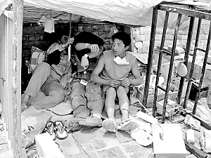 | 王星(左)与他的同学们正在自搭的简易棚中休息。 |