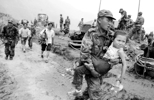 | 连日来,在四川汶川映秀镇灾区,解放军和武警部队官兵风餐露宿,奋战在搜救被困灾民、打通道路和运送物资的前线,并帮助群众转移。 新华社记者 江宏景 摄 |