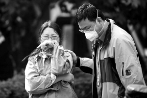 | 5月14日,新华社记者孙闻在德阳市汉旺镇采访时安慰勇护四名学生的遇难教师谭千秋的妻子。