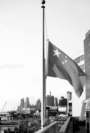 | 当地时间5月18日下午(北京时间5月19日凌晨),在美国纽约,中国驻纽约总领馆降半旗为四川汶川大地震遇难者志哀。 新华社发 |