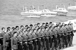 | ↑担负奥运会帆船比赛海上安保任务的青岛公安边防支队官兵在奥帆中心为地震遇难者鸣笛默哀。 新华社记者 李紫恒 摄 |