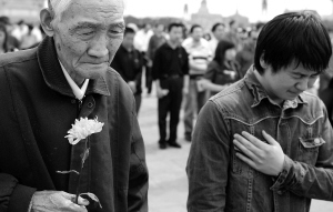 | ↑ 离休干部段金声在天安门广场默哀。新华社记者 王庆钦 摄 |