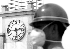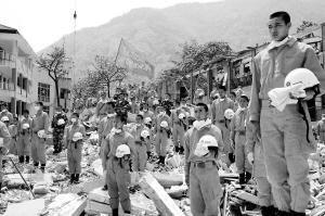 | 黑龙江公安消防总队地震救灾抢险救援队在北川中学救灾现场向汶川大地震遇难者默哀。