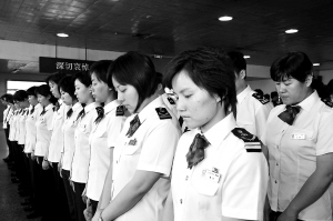 | 济南火车站工作人员在候车室向汶川大地震遇难者默哀。 新华社记者 朱峥 摄 |