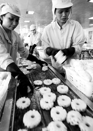 → 日前,海南进入菠萝丰收旺季,本土充足的菠萝产品原料供应,使海南绿沁园实业有限公司的产品源源不断地销往国外。图为工人们正在菠萝罐头生产线上忙碌。