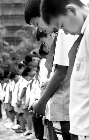 | ←5月19日下午2时28分,在海口的校园里,笼罩悲伤的气氛,师生们集体站立,共同哀悼地震死难同胞。图为海口市第31小学的学生在默哀。