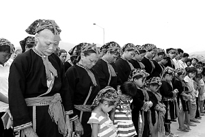 ↑琼中黎族苗族自治县长征镇烟园村,苗族群众为地震遇难者默哀。 黎大辉 摄