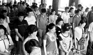 ↑5月19日,南山景区游人为地震遇难者默哀。本报记者 程范淦 通讯员 陈文武 摄