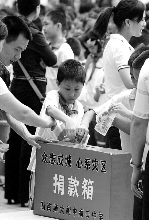 ← 19日上午,湖南师大附中海口中学紧急向四川灾区民政厅申请,认领30至60名孤儿来学校免费读书。与此同时,该校师生向四川地震灾区捐款46.9万元。图为捐款现场。 本报记者 古 月 摄