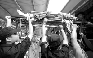 5月19日,工作人员将伤员抬上火车。 当日10时20分,四川灾区首趟运送206名受伤群众的专列离开绵阳,开往重庆。 新华社记者 江毅 摄