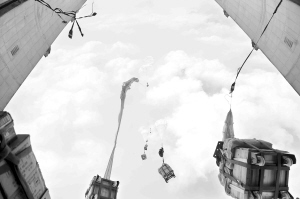 | 5月17日,空军在5500米高空空投救灾物资。当日,空军伊尔-76大型运输机在四川省北川县片口乡、坝底乡等重灾区实施空投。由于当地山高,运输机必须在5500米以上的高空飞行。空降兵某部使用自行研制的便携式氧气装置,解决空投员高空缺氧问题,顺利完成5500米高空的救灾物资空投任务。