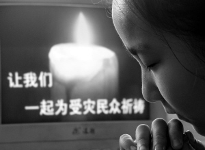套题照片:5月20日,在济南市解放路第一小学,一名同学为汶川大地震遇难同胞祈祷。 新华社发(赵晓明 摄)